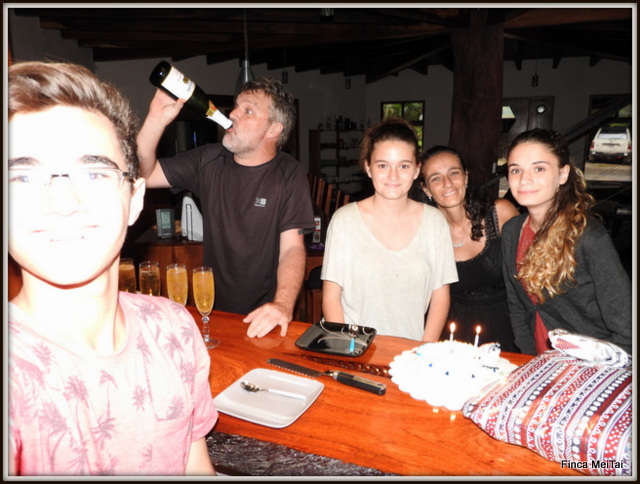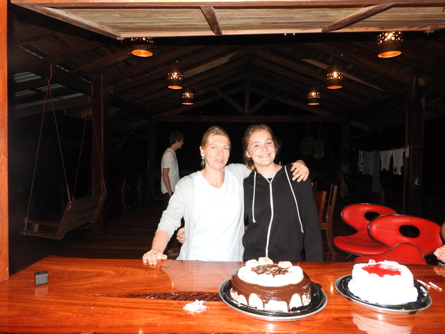 Nous avons mangé un excellent gâteau confectionné par Maeva, la fille des 'autres' Belges de Bijagua, et avons dégusté un cidre millésimé avant que Syr Daria n'ouvre ses cadeaux. Ce fut l'occasion d'évoquer tant de bons souvenirs comme la fois où Syr Daria a pu nager avec les otaries, ou comment elle avait fait le tour du lagon d'Aitutaki sur la mobilette de Marcus... C'était fantastique mais nous avions un programme de festivités bien organisé, aussi avons-nous poursuivi notre chemin jusqu'au Barrigon, la pizzeria du coin avant de revenir à la maison regarder un bon film en famille.