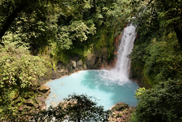 04/08/2016 - Que fait-on avec les visiteurs? On va voir le Rio Celeste ![]() La chute d'eau bleue Notre finca se situe entre les volcans Miravalles et Tenorio, un lieu idéal, en quelque sorte. Sur les flancs de ce dernier (le Tenorio donc) coule un rivière paisible qui serait passée totalement inaperçue si, pour une raison que seuls les scientifiques de haut niveau peuvent expliquer, elle n'était pas bleue. D'un bleu laiteux en fait. Certains avancent des explications mêlant alchimie et esprits malins, moi je dis que ce sont des réservoirs à colorant dissimulés dans la forêt qui lui confèrent cette couleur. Cette idée m'est venue quand j'ai constaté que, plus en amont, la rivière est limpide (et, comme par hasard, depuis le dernier tremblement de terre, dont question antérieurement, on ne peut pas remonter la rivière jusqu'au moment où, subitement, elle devient azur). Ca m'a donné une idée... Puisque le bleu est déjà pris, je pourrais utiliser du rouge et créer ainsi une attraction mondiale dans ma finca (où les rus ne manquent pas - mais les chutes d'eau si).