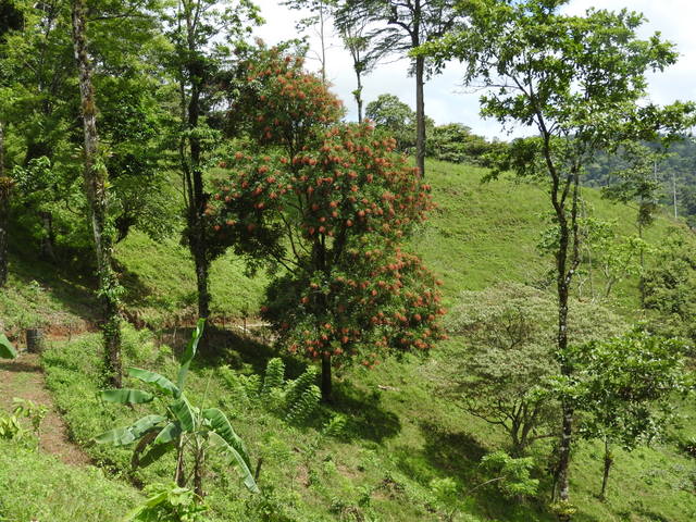 Petite précision: sur la photo ci-dessus, l'arbre rouge est un cirri, les autres sont des Laurels, des Maderos Negros, un Nispero et des trucs. En bas, légèrement à gauche, vous distinguez facilement un bananier. A l'avant plan, devant et à gauche du bananier, ce sont deux arbustes de cacao... Le chocolat, c'est pas pour demain! Et le Site Commercial: www.Finca-MeiTai.com |